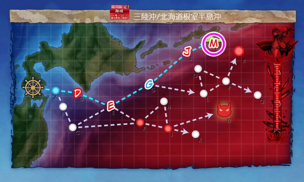 【E1】第二ボス開放ギミック【2021秋イベ】 2021.11.20 イベント艦これ攻略 目次 ギミック内容海域編成 ギミック内容 【Mマス A勝利以上】 海域 D:対潜 E:通常 G:能動分岐 J:通常 M:通常(ギミックマス) 編成 ルート D:対潜 E:通常 G:能動分岐 J:通常 M:通常(ギミックマス) ・編成艦種:戦艦1 正空1 軽空1 軽巡1 駆逐2 ・目標制空:216 ・必要索敵:0 ・艦隊速度:低速可 支援:無し 軽巡1駆逐2速度不問ルートを選択。 第1ゲージの3隻を変えた形。もし周回するならボーキが辛い。