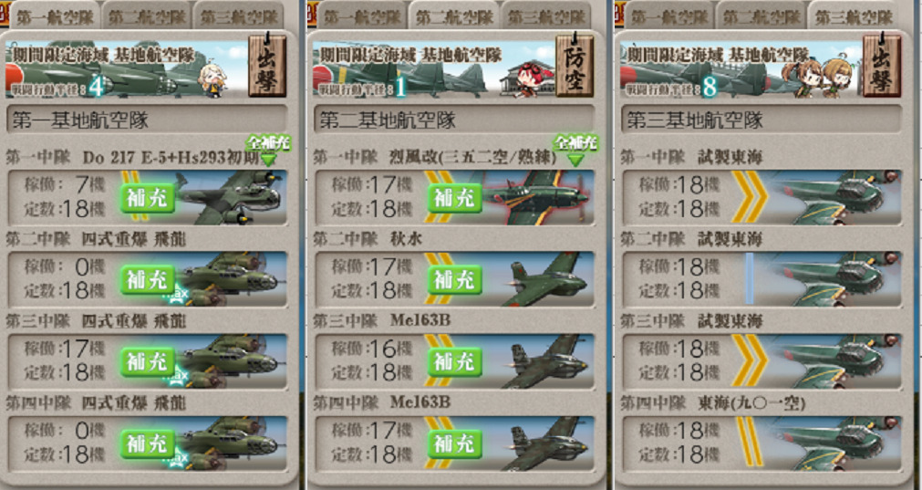 【E4】戦力1(第一ゲージ)【2022冬イベ】 2022.03.11 イベント艦これ攻略 目次 海域編成 海域 A:対潜 B:夜戦PT C:通常 C2:夜戦 F:通常(ボス) 編成 削り ラスト ・編成艦種:軽巡1 駆逐4 ・目標制空:0 ・必要索敵:一定以上 ・艦隊速度:わからん ・基地航空:F集中・防空・A集中 ・支援艦隊:無し ルート A:対潜 B:夜戦PT C:通常 C2:夜戦 F:通常(ボス) 司令部撤退を利用した5隻編成。 道中にPTがいるため多少の対策を。